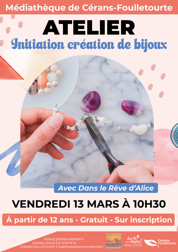 La médiathèque de Cérans-Foulletourte propose un atelier de création de bijoux avec « Dans les rêves d’Alice » le vendredi 13 mars à 10h30. Gratuit, à partir de 12 ans. Sur inscription auprès de la médiathèque au 02 43 87 61 92 ou par mail mediatheque@cerans-foulletourte.fr