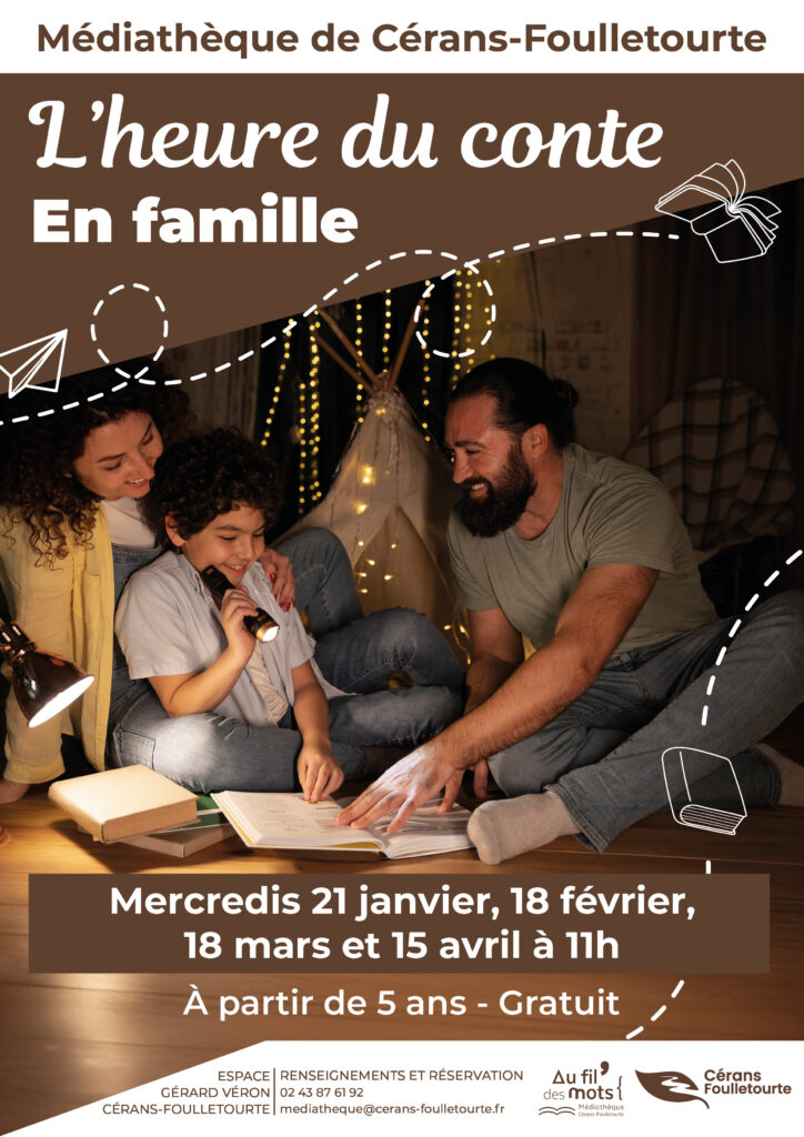 La médiathèque de Cérans-Foulletourte invite les familles à l’heure du conte les mercredis 21 janvier, 18 février, 18 mars et 15 avril à 11h00.